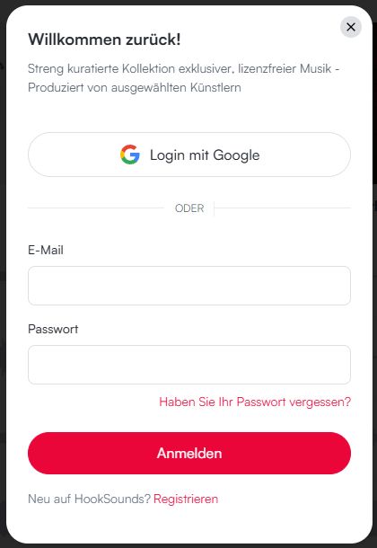 - Melde dich in deinem HookSounds-Konto an. Es erscheint ein Pop-up-Fenster, in dem du dich zuerst anmelden musst. Falls du noch kein HookSounds Konto hast, kannst du hier eins kostenlos