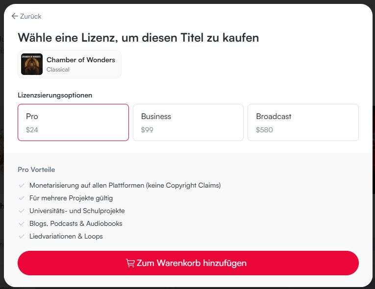 Mit einer Einzellizenz erwirbst du die Nutzungsrechte für eins unserer Produkte (Musik oder Soundeffekt) für deine Projekte. Wir bieten verschiedene Einzeltitellizenzen an, darunter die Use & Mention Lizenz, die Pro-Lizenz, die Business-Lizenz und die Broadcast-Lizenz, die dir die Verwendung unserer Musik für unterschiedliche Zwecke ermöglicht.