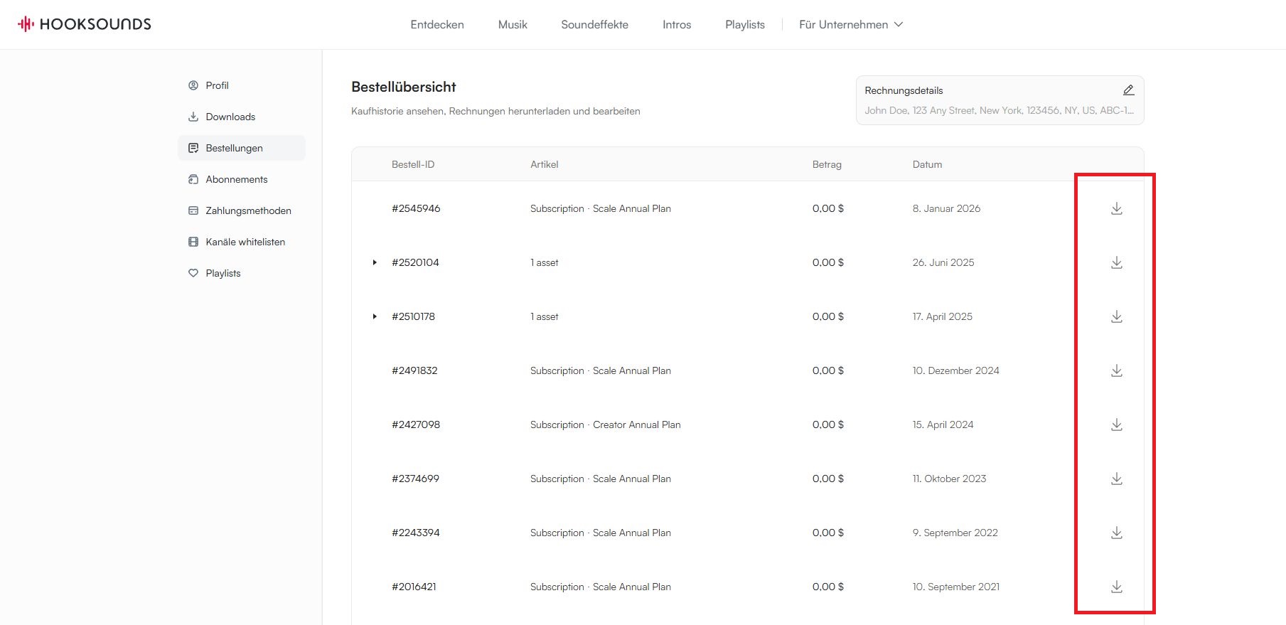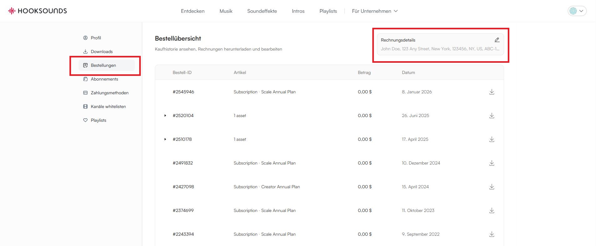 Deine Bestellübersicht erreichst du über dein HookSounds-Profil. Von dort aus kannst du dir alle Rechnungen (Kaufbelege) nachträglich noch einmal herunterladen.
